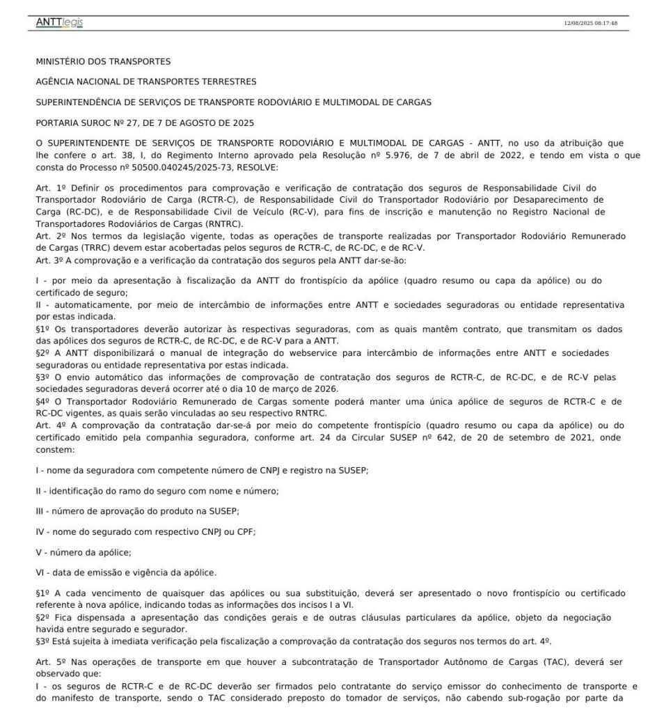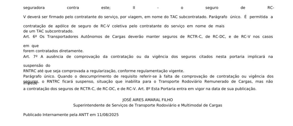 Segundo a portaria, a fiscalização vai exigir a apresentação do quadro resumo (capa da apólice) ou do certificado de seguro. A verificação também poderá ser automática, por intercâmbio de informações entre ANTT e sociedades seguradoras ou entidade representativa por estas indicada. Transportadores deverão autorizar suas seguradoras a encaminhar à agência as informações das apólices dos seguros dos três seguros.