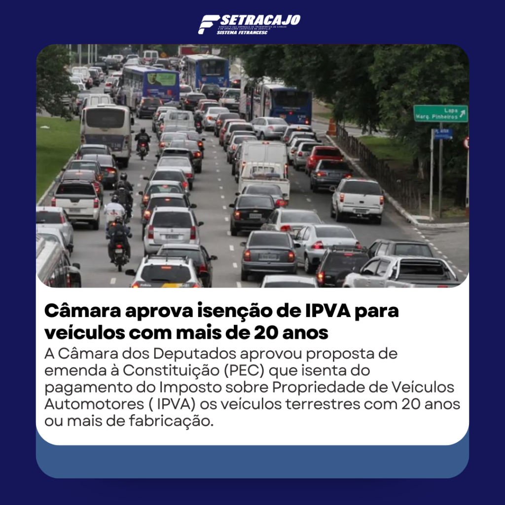 A Câmara dos Deputados aprovou proposta de emenda à Constituição (PEC) que isenta do pagamento do Imposto sobre Propriedade de Veículos Automotores ( IPVA) os veículos terrestres com 20 anos ou mais de fabricação. O texto, do Senado, foi aprovado em dois turnos, no dia 2 de dezembro, e segue para promulgação.