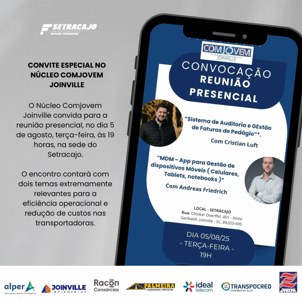 O Núcleo Comjovem Joinville convida para a reunião presencial, no dia 5 de agosto, terça-feira, às 19 horas, na sede do Setracajo.