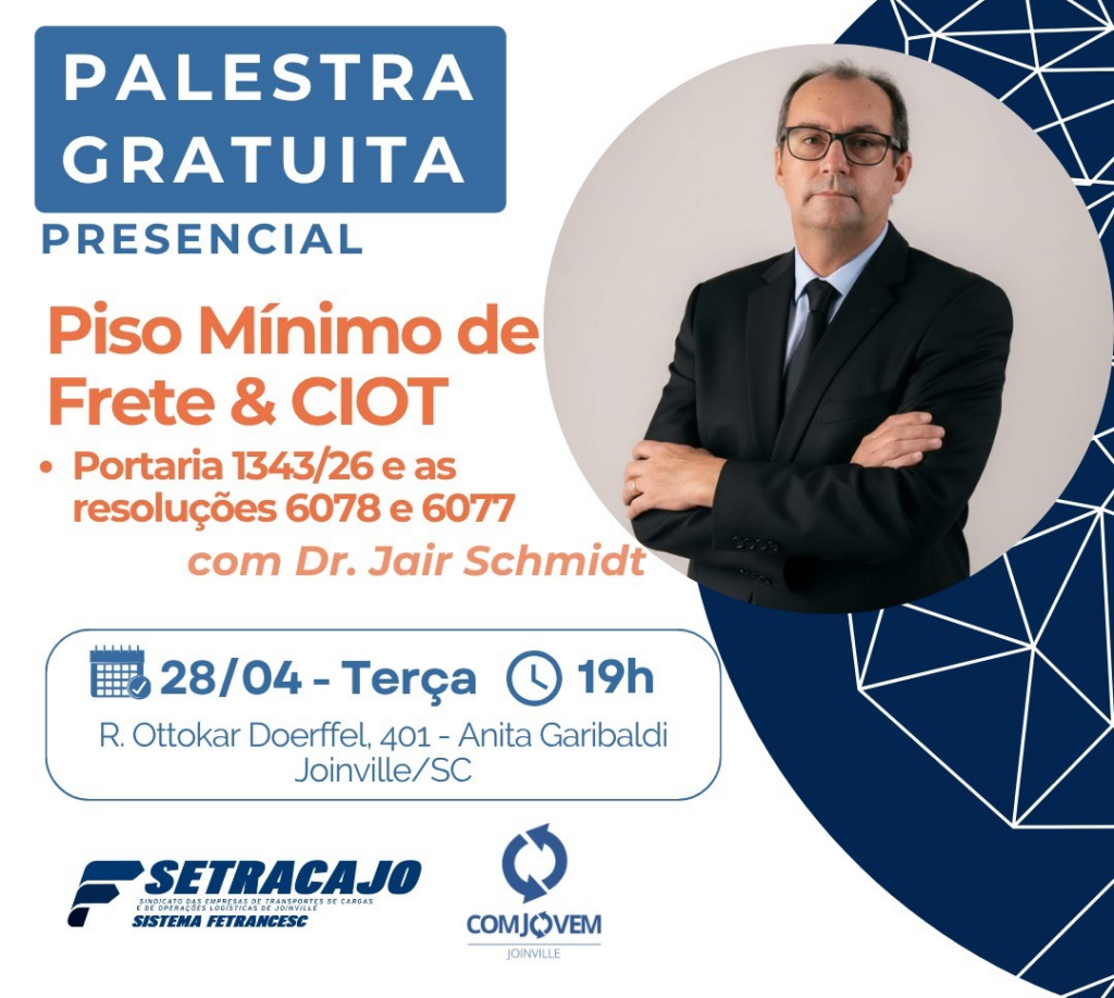 O Dr. Jair Schmidt irá falar sobre o Piso Mínimo de Frete e CIOT, abordando a Portaria 1.343/26 e Resoluções 6.078 e 6.077