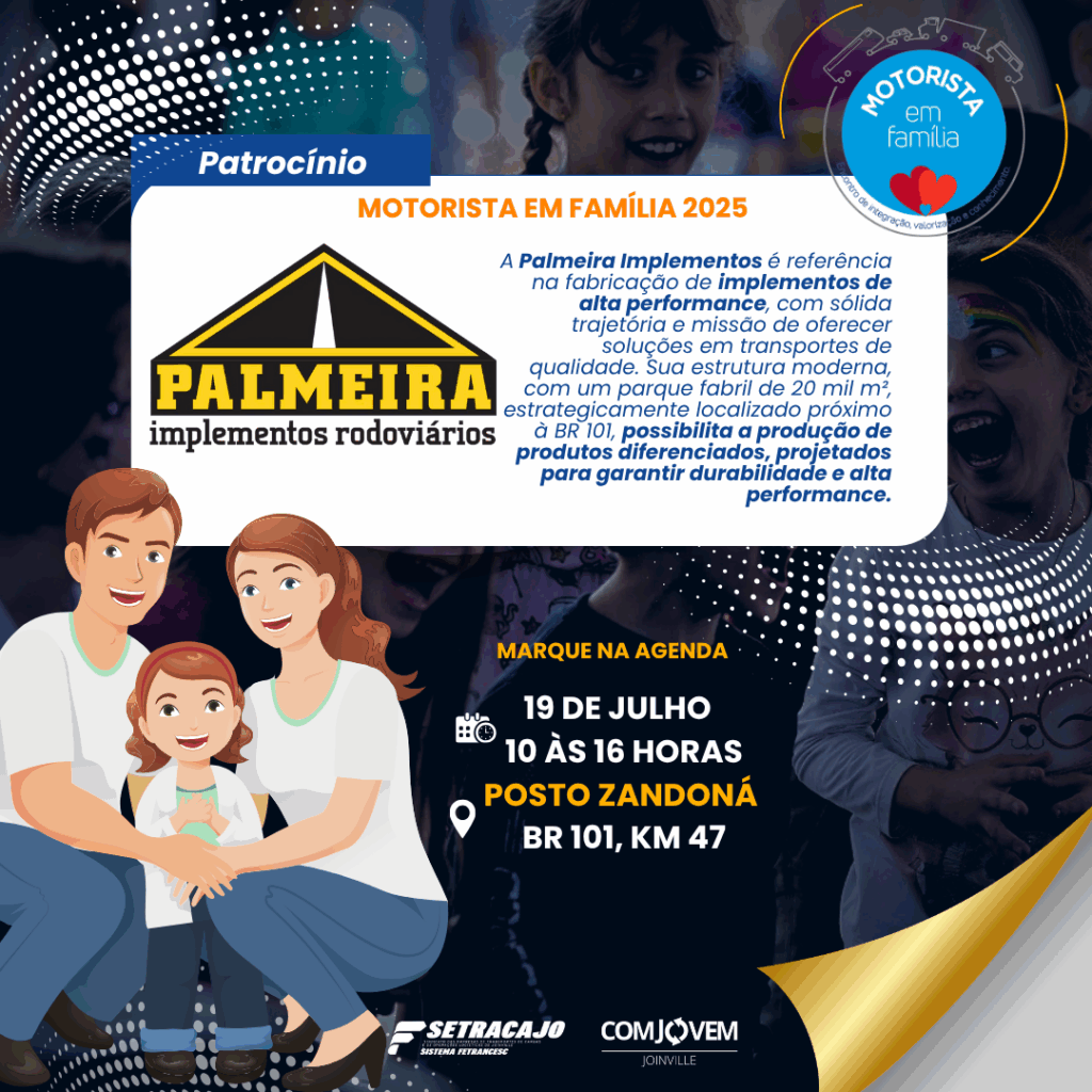 É com grande orgulho que contamos com o patrocínio PRATA da Palmeira Implementos no 7º Motorista em Família, que será realizado no dia 19 de julho de 2025, das 10h às 16h, no Posto Zandoná 5, localizado ao lado do Hotel Zandoná, na BR 101, KM 47, no bairro Nova Brasília, em Joinville/SC.