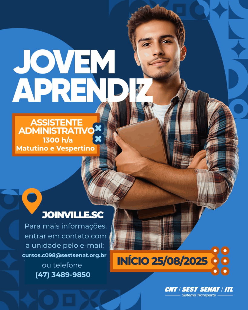 O SEST SENAT Joinville está com inscrições abertas para a próxima turma do curso de Jovem Aprendiz – Assistente Administrativo, com início previsto para 25/08/2025.