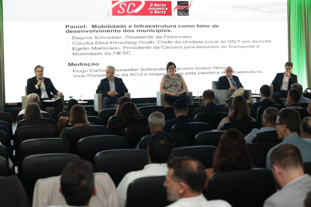 O painel “Mobilidade e Infraestrutura como fator de desenvolvimento dos municípios” trouxe lideranças do setor público e empresarial, que reforçaram a importância de investimentos estruturantes nas rodovias federais e estaduais que passam pelos municípios do Norte para sustentar o crescimento regional. Participaram do debate o presidente da Fetrancesc, Dagnor Schneider; a chefe da unidade local do DNIT em Joinville, Cláudia Elisa Hinsching Pirath; os vice-presidentes da ACIJ, Jácomo Isotton Neto e Hugo (presidente do Setracajo), Carlos Rassweiler Schneider; além de Egidio Martorano, presidente da Câmara para Assuntos de Transporte e Mobilidade da FIESC.
