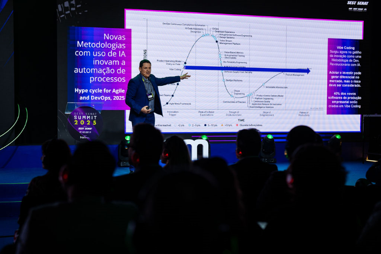 No setor de transporte, ele observou que a IA generativa está em uma fase mais madura e já superou o “vale da desilusão”, termo da Gartner para o momento em que se percebe que a tecnologia não entrega imediatamente tudo o que foi prometido. Entre as inovações, destacou o Vibe Coding, abordagem que permite criar software a partir de comandos em linguagem natural, acelerando o desenvolvimento mesmo para quem não tem grande experiência em programação.