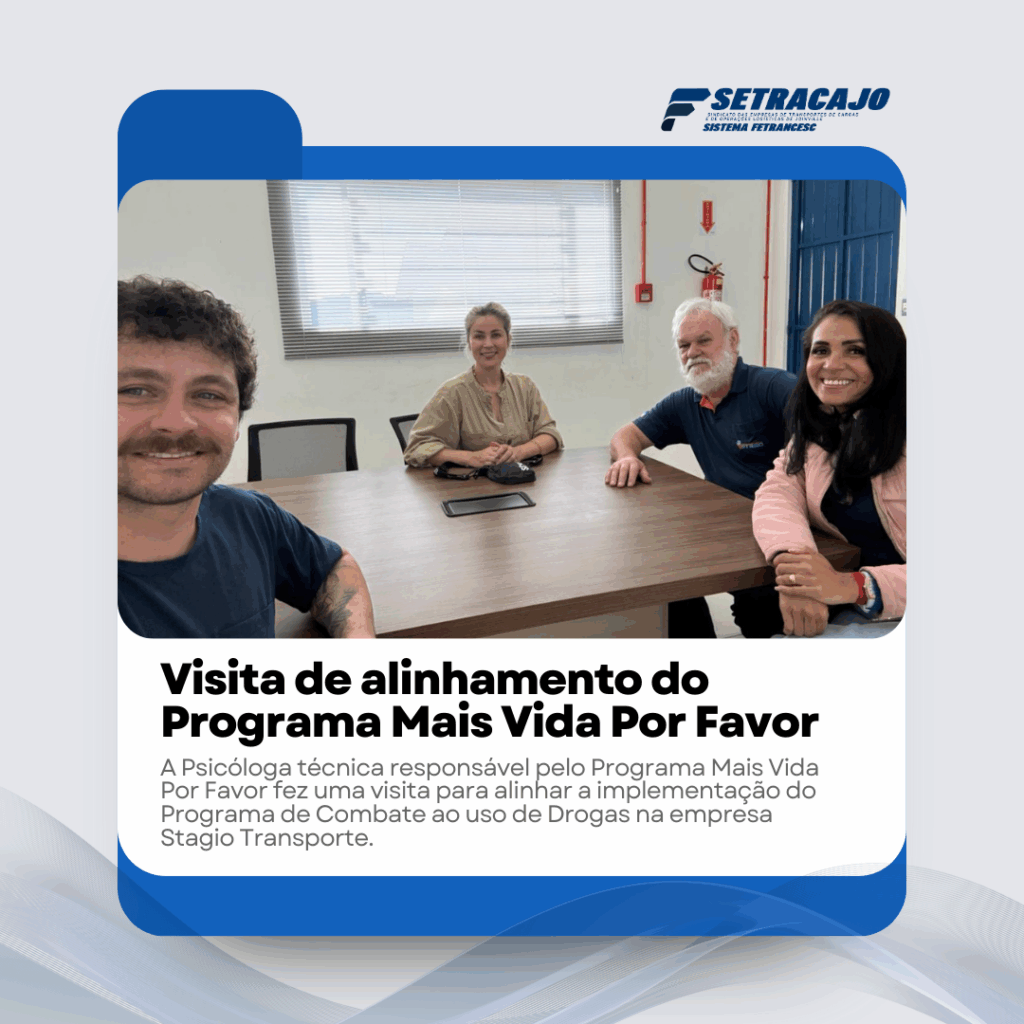 No dia quatorze de julho, a Psicóloga técnica responsável pelo Programa Mais Vida Por Favor fez uma visita para alinhar a implementação do Programa de Combate ao uso de Drogas na empresa Stagio Transporte.